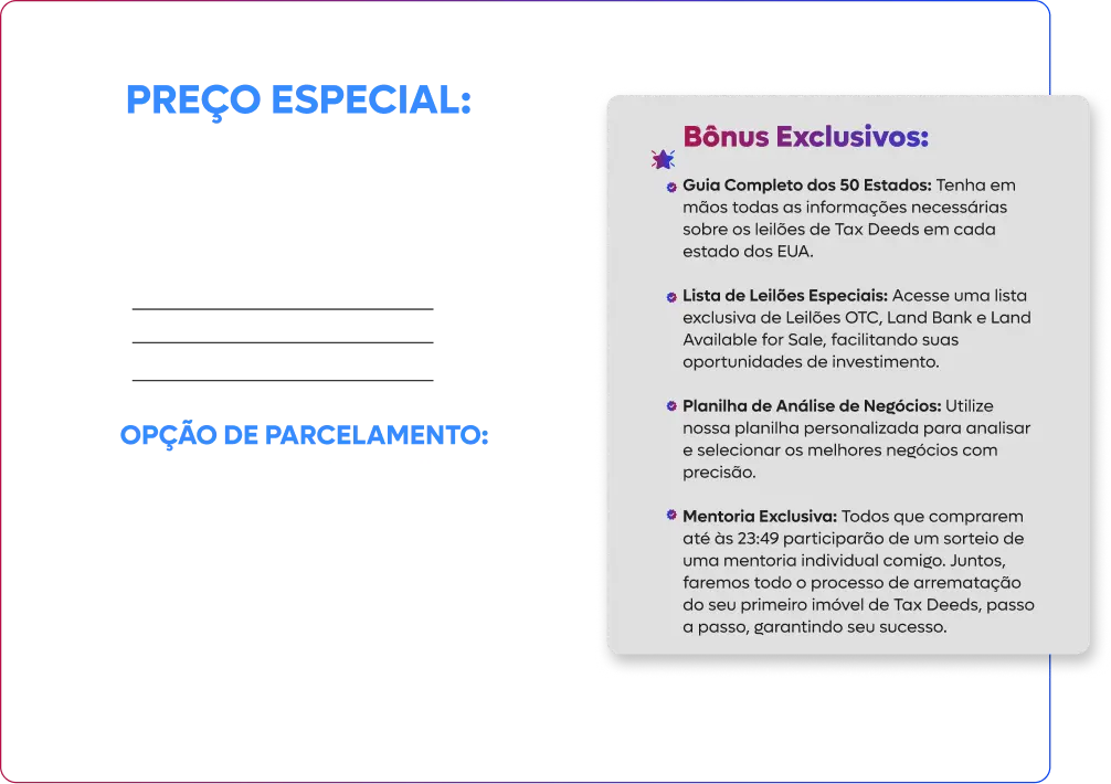 E agora, através do Método iREI, você vai simplificar o seu caminho para você sair da ralação sem afetar as finanças da sua família e vai te ajudar a ganhar de $5 mil a $10 mil dólares com Imóvel nos EUA sem tirar 1 centavo do bolso te proporcionando mais tempo com sua família e a tão desejada estabilidade financeira.